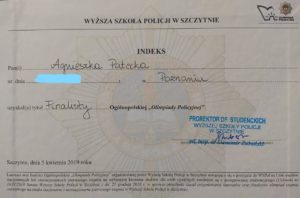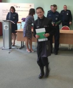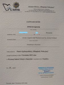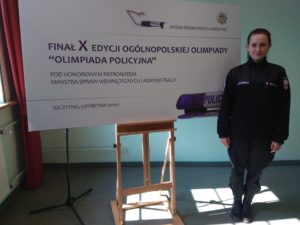 W dniu 5 kwietnia 2019 r. odbyła się X edycja ogólnopolskiej „Olimpiady Policyjnej” organizowanej przez Wyższą Szkołę Policji w Szczytnie. Do finału zakwalifikowała się nasza uczennica z klasy 3O4 nadkadet Agnieszka Patecka, która stanęła na wysokości zadania i w klasyfikacji końcowej znalazła się wśród finalistów. Za zajęcie miejsca wśród najlepszych piętnastu olimpijczyków zdobyła indeks na wybrany kierunek studiów pierwszego stopnia dla osób cywilnych, realizowany w Wyższej Szkole Policji w Szczytnie. Na uwagę zasługuje fakt, że w tegorocznej edycji Olimpiady udział wzięło 53 uczestników z 20 szkół z całej Polski. Jesteśmy dumni z trzeciej w historii naszej szkoły laureatki Olimpiady Policyjnej w Szczytnie i życzymy Jej dalszych sukcesów w dążeniu do realizacji marzeń i planów zawodowych.