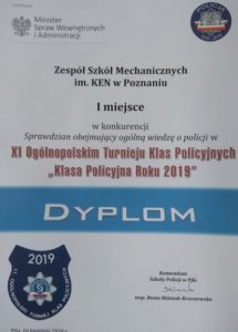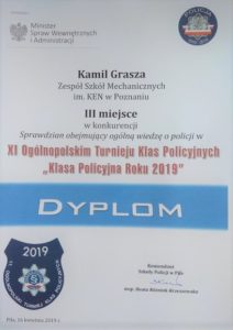 Nasza reprezentacja w składzie: Agnieszka Patecka, Maja Malinowska, Kamil Grasza i Konrad Czajkowski okazała się bezkonkurencyjna w kategorii „Wiedza o Policji” zajmując 1 miejsce w Polsce! Dodatkowo Kamil wywalczył indywidualnie 3 miejsce w tej kategorii. W klasyfikacji generalnej zajęliśmy 6 miejsce poprawiając ubiegłoroczny wynik, aż o siedem pozycji.